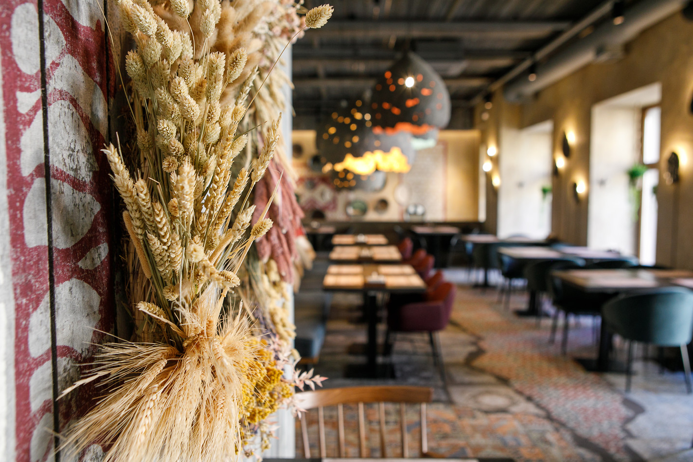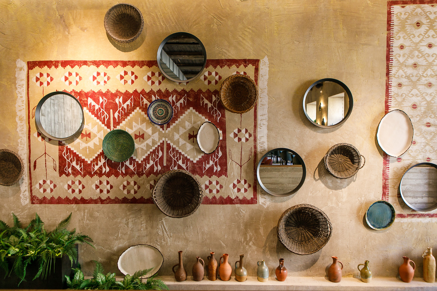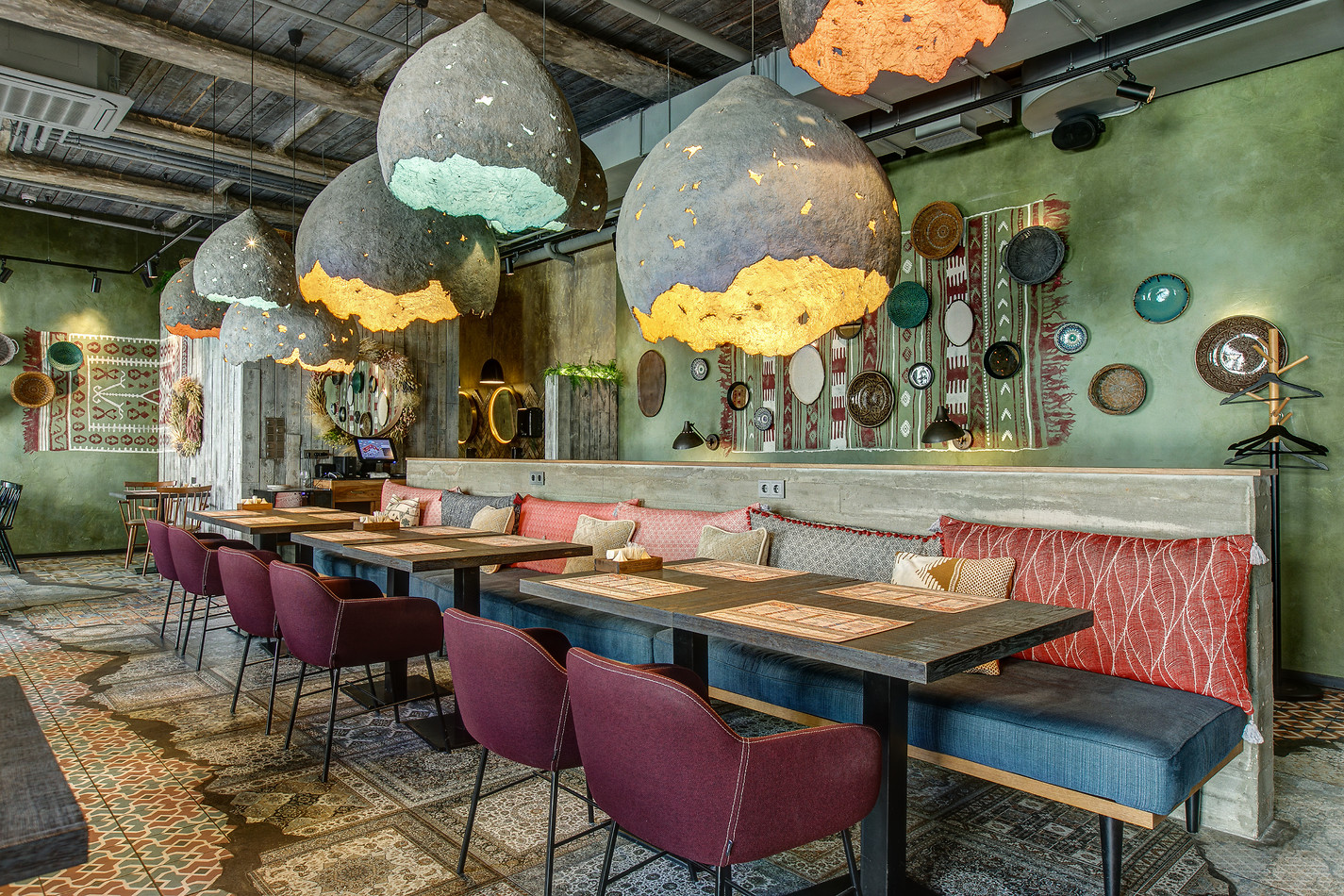 В интерьере сочетаются восточная классика и современные детали: мягкие подушки с восточными узорами и грубые деревянные балки, плетеные тарелки на стенах и неотесанный камень, живая зелень и гигантские абажуры из лозы. Все это создает идеальный симбиоз этнических акцентов и натуральных текстур.